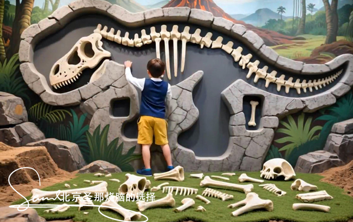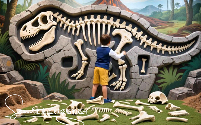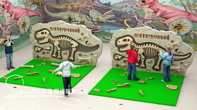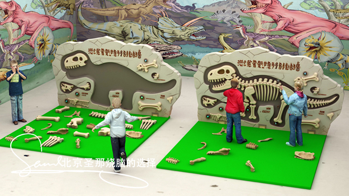 在地上恐龙骨骼中寻找带有磁吸的合适的骨骼,放到对应位置才会吸住,这是一个很烧脑的选择,在否定中寻找吸住的骨骼。
