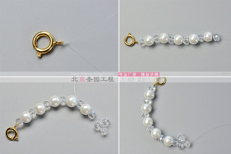 2、北京圣园超级矿工儿童淘矿部落DIY切断一根电线。然后,加入6颗6x4mm水晶采光算盘玻璃珠和5颗8mm白色圆形珍珠珠(如图);