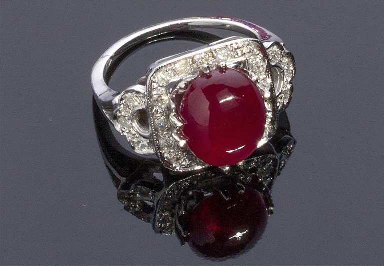 这款 9k 金戒指饰有一颗“复合”红宝石,填充有铅玻璃。