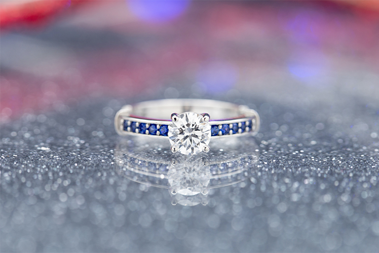 这款定制的实验室培育钻石订婚戒指还饰有“蓝色”、槽镶蓝宝石。