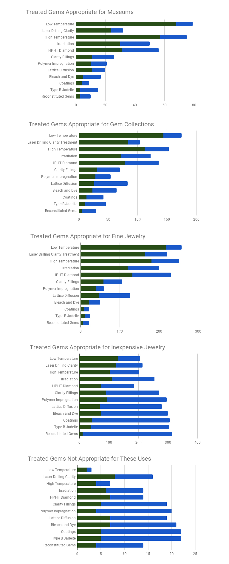 这些北京圣园儿童淘宝石淘矿小镇科普列出的图表显示了每种处理的响应计数,按照响应者是否认为宝石是天然的(绿色)或非天然(蓝色)来区分。请注意 x 轴上的变化比例。