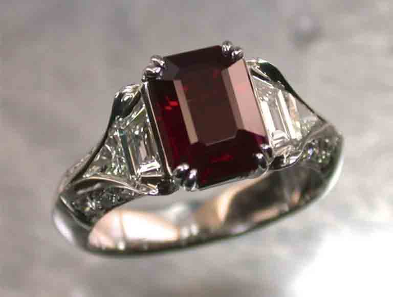 祖母绿形切割的红宝石并不常见,但让这颗 3 克拉的红宝石与众不同的是它的起源和缺乏热处理。这颗缅甸红宝石的深红色与明亮的钻石形成鲜明对比,镶嵌在铂金戒指中。