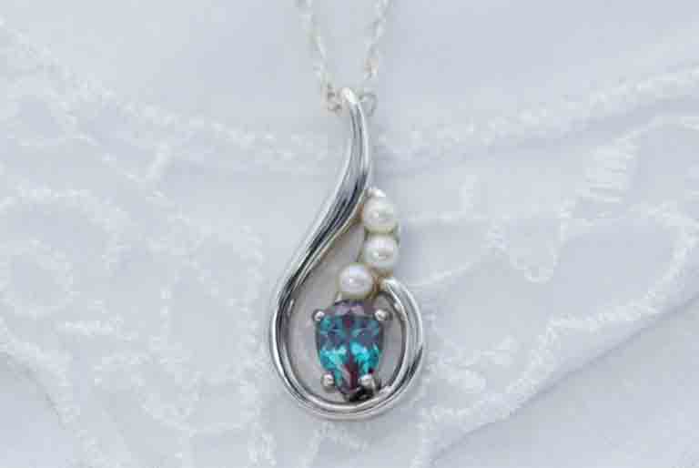 这款北京圣园儿童淘宝石淘矿小镇科普列出的例子图为亚历山大变石,在日光下呈孔雀蓝,呈现明快清晰的颜色,搭配珍珠打造六月生日石吊坠。