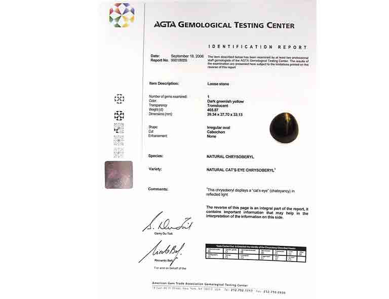 2006年9月,狮子之眼访问了纽约的 AGTA 实验室以获取更新的鉴定报告: