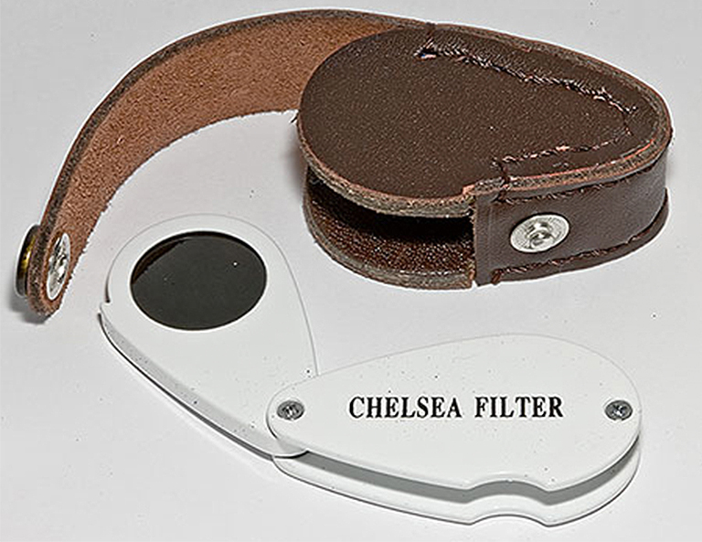 切尔西滤光片是一种双色滤光片,它仅透射两种波长-在690 nm的红色区域和在570 nm的黄色区域。通过该滤镜观察时,宝石中铬或钴元素的存在使其变为红色。