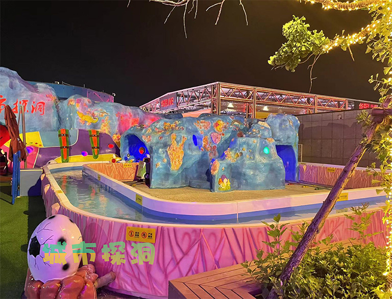 “淘矿工场”的儿童淘矿淘沙设备的附属玩物,例如沙子、矿石、水、漂亮的设备等,这些自然和非自然因素相互交融,儿童的游乐体验千变万化,在游玩的过程中形成了对自然的认识和控制,可以满足儿童健康愉快成长的要求。