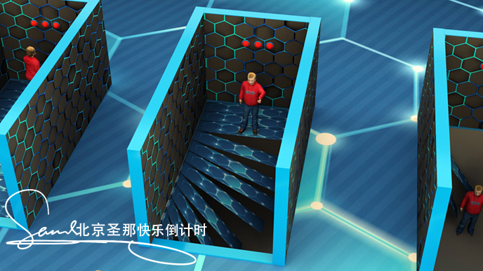 第一步,体验者入场,面前有三个颜色一样的红按钮,只有一个是幸运按钮,按到就可以全身而退。